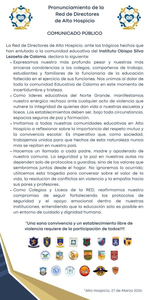 Queremos expresar nuestro más profundo pesar por los hechos que han afectado a la comunidad educativa del Instituto Obispo Silva Lezaeta de Calama.