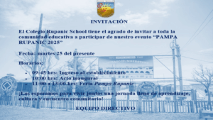 El Colegio Rupanic School, tiene el agrado de invitar a toda la comunidad educativa a participar de nuestro evento “Pampa Rupanic 2025” este día martes 25 de Noviembre. Los horarios son